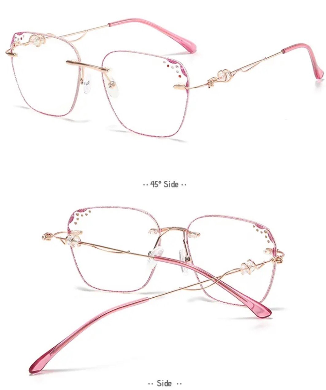 Embrace the trend with our sparkling glitter design. The glasses feature shimmering glitter accents that add a touch of glamour to your eyewear. Stand out from the crowd and make a fashion statement with these stylish glasses. perfect for any occasion.